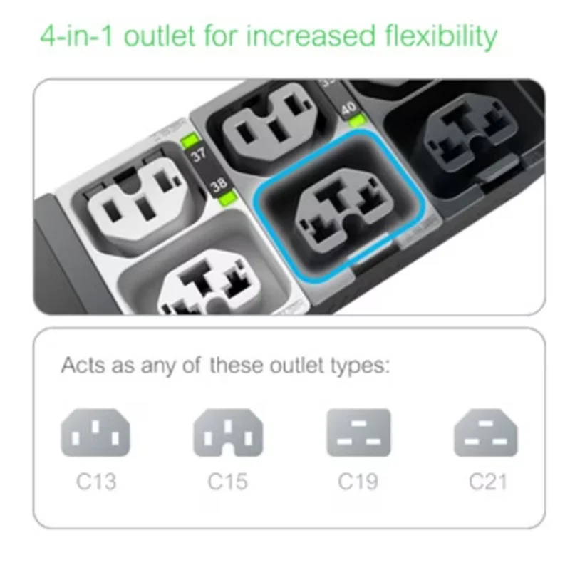 - 48 универсальных розеток (C13/C15/C19/C21) для максимальной гибкости