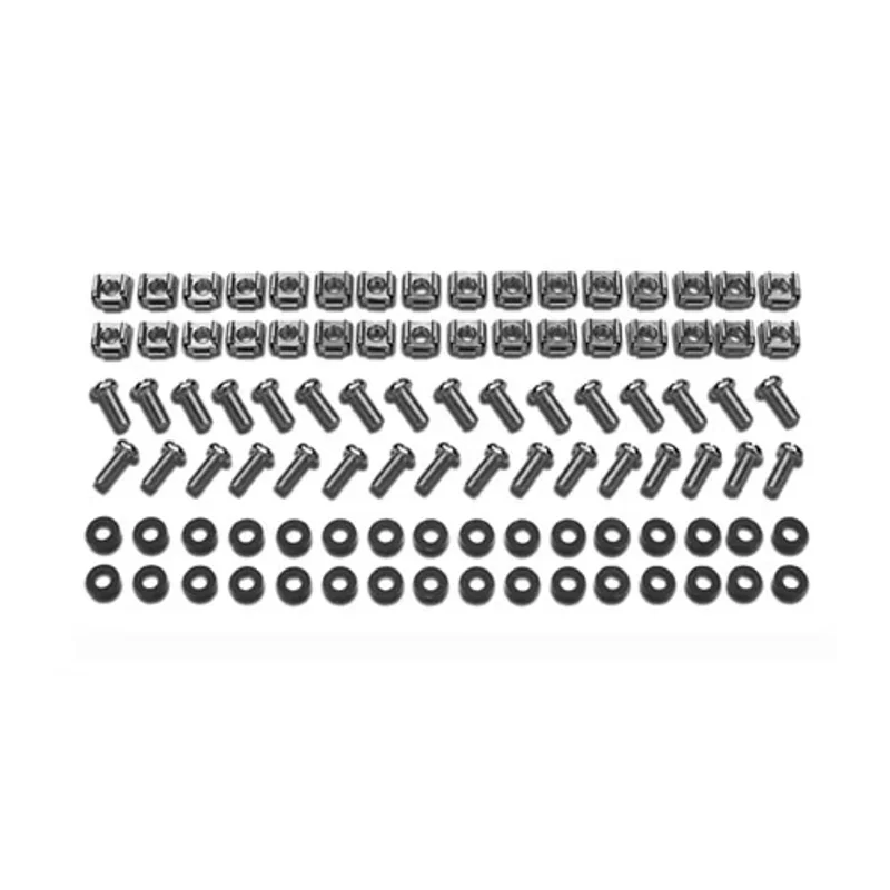 Комплект APC AR8100 M6 включает в себя 32 полных набора крепежных элементов, каждый из которых состоит из M6 гаек-клеток (cage nuts), нейлоновых шайб и винтов с комбинированным шлицем (slot/phillips). Эти компоненты тщательно подобраны для обеспечения максимальной совместимости и простоты использования. Гайки-клетки M6 предназначены для быстрой и надежной фиксации в квадратных монтажных отверстиях, которые являются стандартом для большинства современных серверных стоек и телекоммуникационных шкафов. Нейлоновые шайбы служат для предотвращения повреждения поверхности оборудования и снижения вибрации, обеспечивая дополнительную защиту и стабильность. Винты с комбинированным шлицем предлагают гибкость при установке, позволяя использовать как плоскую, так и крестообразную отвертку, что значительно упрощает процесс монтажа в условиях ограниченного пространства.