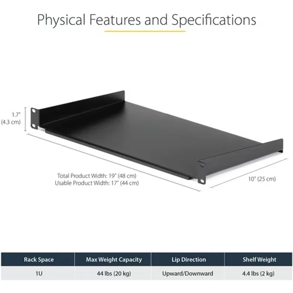 Надежная 1U стоечная полка StarTech.com CABSHELF1U10 глубиной 10 дюймов (25.4 см) идеально подходит для организации оборудования в 19-дюймовых серверных, сетевых и A/V шкафах. Выдерживает до 20 кг, обеспечивая эффективное использование пространства.