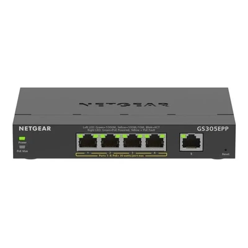 Мощный управляемый коммутатор Netgear GS305EPP с 5 портами Gigabit Ethernet, включая 4 PoE+ (120 Вт), идеально подходит для малых и средних сетей, требующих надежного питания и гибкого управления для VoIP, IP-камер и WAP.