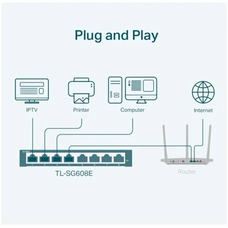 Представляем TP-Link TL-SG608E – 8-портовый гигабитный Easy Smart коммутатор, разработанный для эффективного расширения вашей домашней или офисной сети. Этот Ethernet Switch сочетает в себе высокую производительность, интеллектуальные функции управления и выдающуюся энергоэффективность, делая его идеальным выбором для пользователей, ценящих надежность и экономичность.