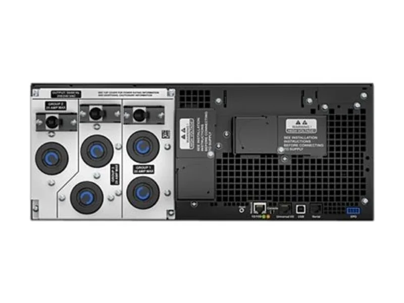 ИБП оснащен пятью выходными розетками для подключения оборудования: две NEMA L6-20R и три NEMA L6-30R, а также одним жестким подключением 3-wire (2PH + G). Это обеспечивает гибкость при подключении различных типов нагрузок. Встроенная карта сетевого управления (Web/SNMP management card) позволяет осуществлять удаленный мониторинг и управление ИБП через сеть, что критически важно для современных IT-инфраструктур. Дополнительный слот SmartSlot расширяет функциональность устройства.