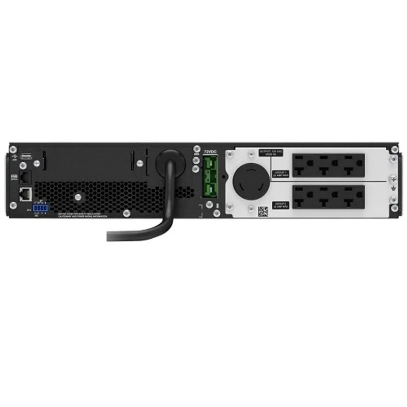 Модель SRT2200RMXLA поставляется в стоечном исполнении 2U, что позволяет эффективно использовать пространство в серверных шкафах. В комплекте поставляются монтажные рельсы, упрощающие установку. Для подключения оборудования предусмотрено 7 розеток NEMA: одна NEMA L5-20R и шесть NEMA 5-20R, что обеспечивает широкие возможности для подключения различных устройств. Наличие слота SmartSlot открывает доступ к расширенным функциям сетевого управления, позволяя интегрировать ИБП в существующие системы мониторинга и удаленного контроля. Порт EPO (Emergency Power Off) обеспечивает возможность быстрого отключения питания в экстренных ситуациях, повышая безопасность эксплуатации.