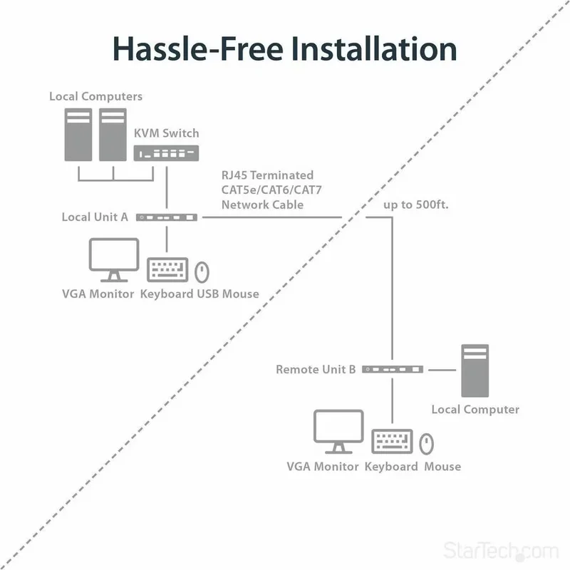 KVM-удлинитель StarTech.com SV565UTPU представляет собой высокоэффективное решение для IT-специалистов, системных администраторов и всех, кто нуждается в удаленном управлении серверами или рабочими станциями. Этот настольный (Desktop) KVM-удлинитель позволяет значительно увеличить расстояние между консолью управления (монитор, клавиатура, мышь) и двумя поддерживаемыми компьютерами, используя стандартный кабель CAT5 UTP. Забудьте об ограничениях коротких кабелей – с SV565UTPU вы получаете максимальное рабочее расстояние до 500 футов (приблизительно 152 метра), что открывает новые возможности для организации серверных комнат, центров обработки данных или просто более гибкого рабочего пространства.